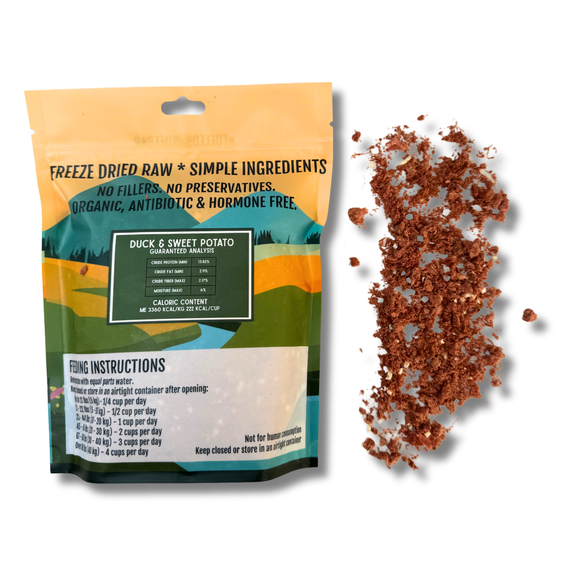 Our traditional Ruff Food is freeze-dried in a loose form and comes in a resealable bag. Simply rehydrate as a meal or sprinkle on their food as a topper and watch your pup enjoy.