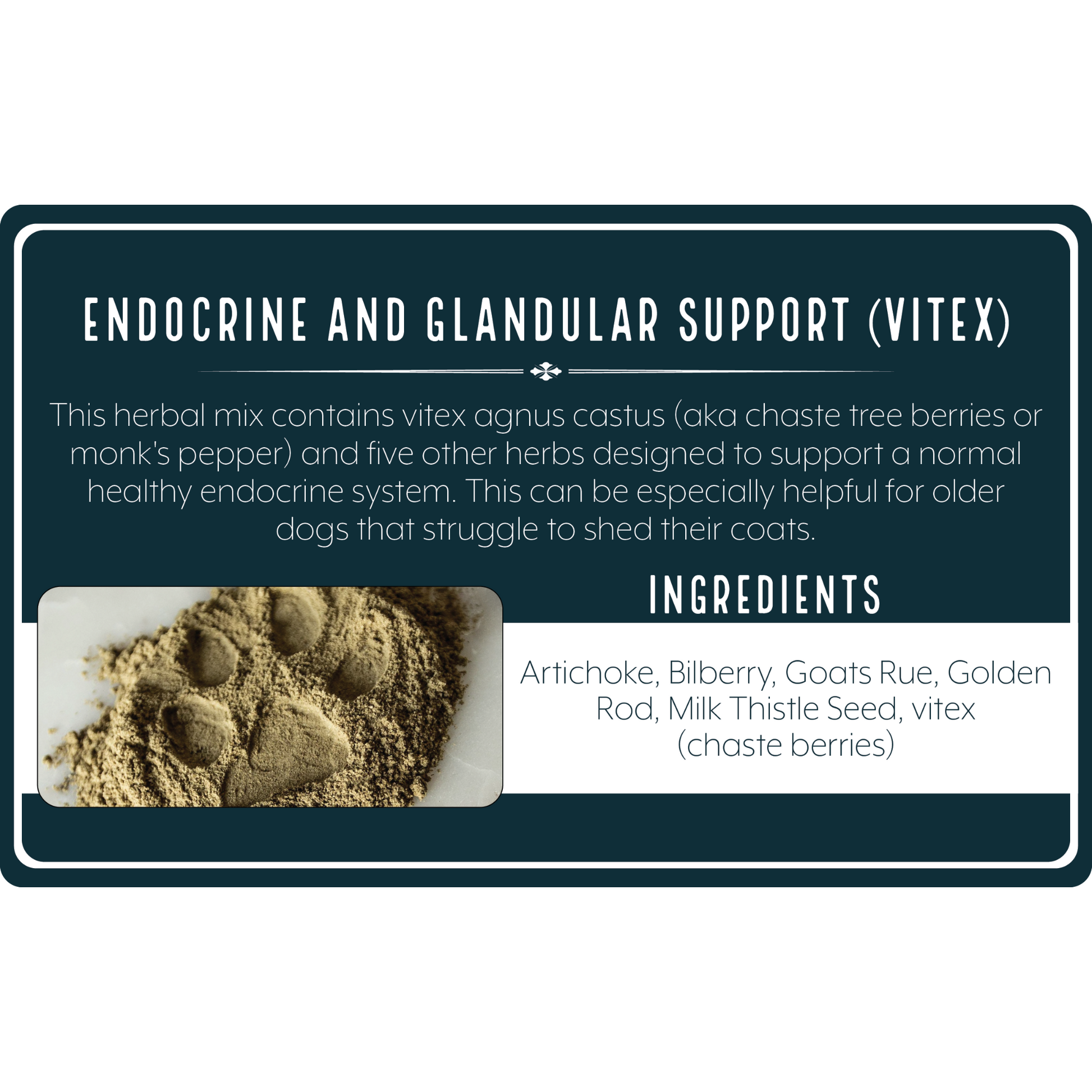 This herbal mix contains vitex agnus castus (aka chaste tree berries or monk's pepper) and five other herbs designed to support a normal healthy endocrine system. This can be especially helpful for older dogs that struggle to shed their coats.