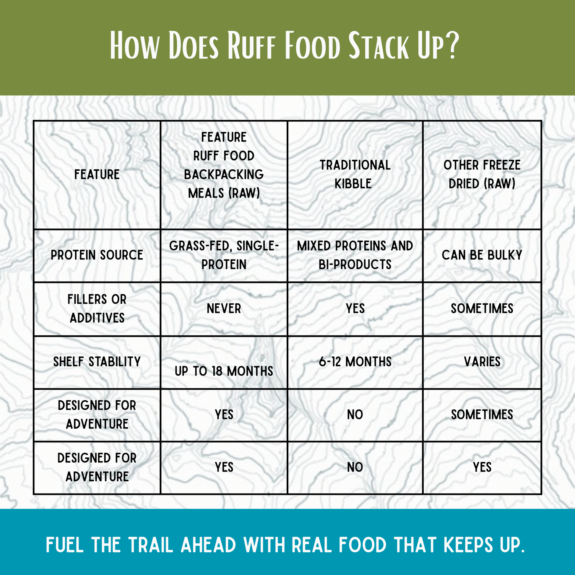 Perfect for dogs on the go, on the trail, as a meal topper, or in water to encourage hydration, Ruff Food is a great raw food options when on the go, adventuring, or if you forget to thaw out your dog’s food!
