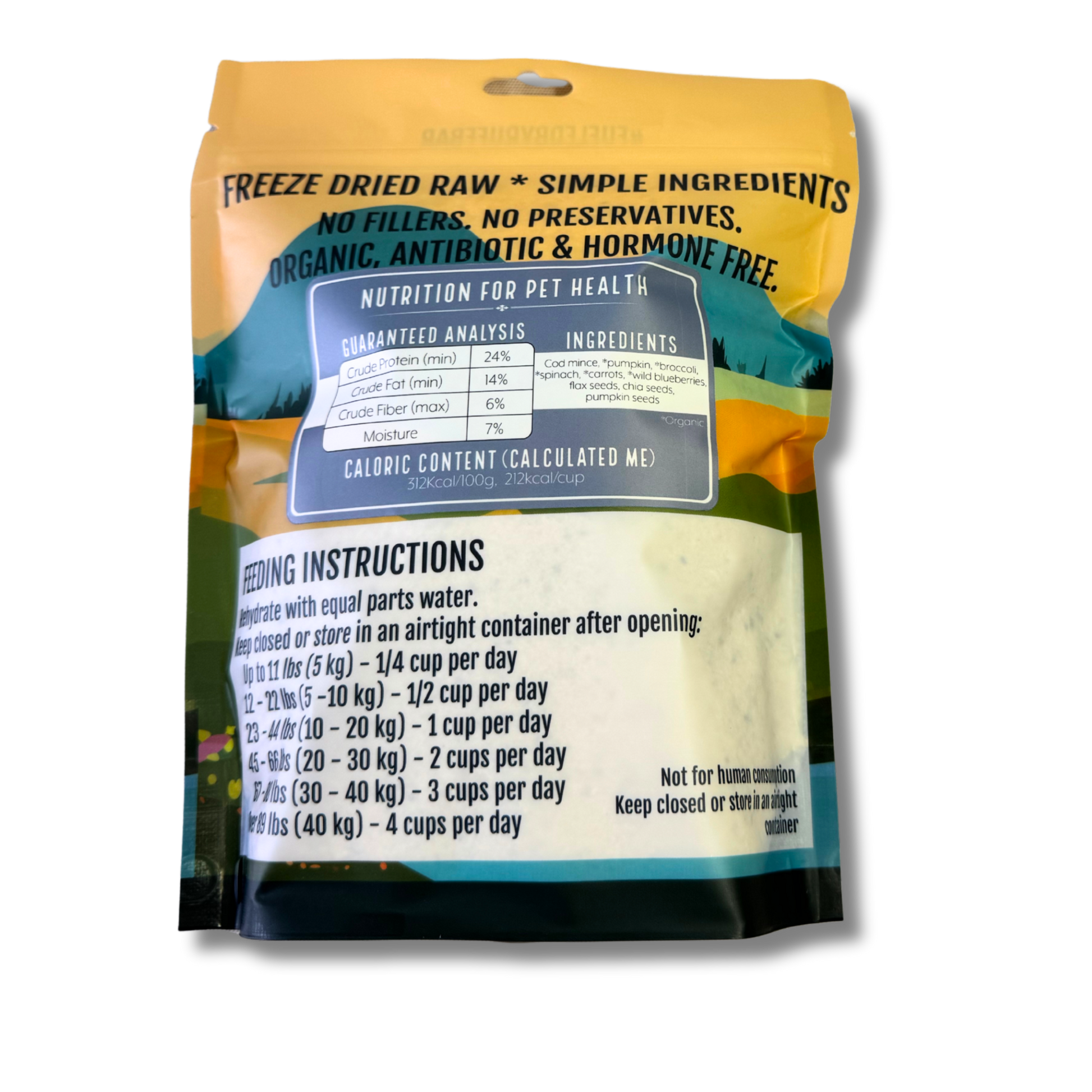 Ruff Food Ingredients: Cod mince, *pumpkin, *broccoli,*spinach, *carrots, *wild blueberries, flax seeds, chia seeds,